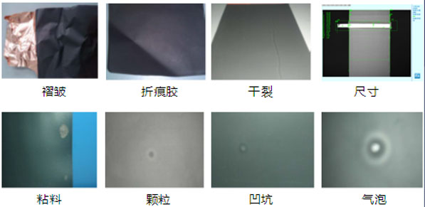 極片項目檢測:極片邊緣缺損面積檢測、極片折皺不良、接帶檢測、極片漏金屬檢測、貼膠露頭長度、貼膠垂直度檢測、膠紙是否蓋住極片、對位貼膠紙錯位檢測、有無保護膠紙檢測