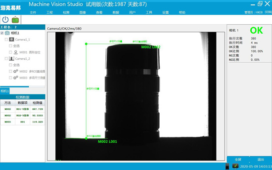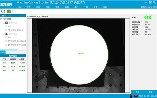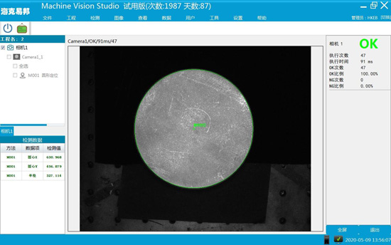 工位二: 相機位置調整完畢后,接收拍照命令,檢測當前產品的輪廓尺寸及中心點位置坐標。