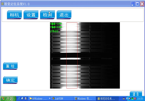 本系統包含視覺定位以及點膠控制兩個部分。視覺系統采用高分辨率工業相機,在連續模式下,實時監控檢測圖像中是否出現竹簽圖像,當視覺檢測到竹簽后,視覺系統發送停機信號給點膠控制系統,點膠控制系統收到停機信號后,停止傳輸帶。并發送定位信號給視覺系統,視覺系統收到定位信號后,檢測圖像中竹簽位置,并發送竹簽坐標信息給控制系統。控制系統收到坐標信息后,控制點膠頭移動到竹簽位置,并點膠。點膠完畢,發送開始檢測信號給視覺系統,如此循環。