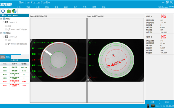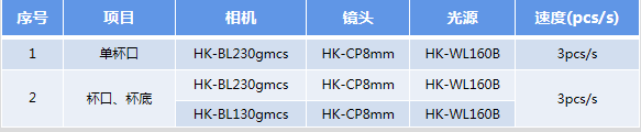 1.主要功能:紙杯口部、紙杯底部缺陷檢測、污漬檢測,檢測結果IO信號輸出。   2.主要功能:紙杯外側壁缺陷檢測、污漬檢測,檢測結果IO信號輸出。