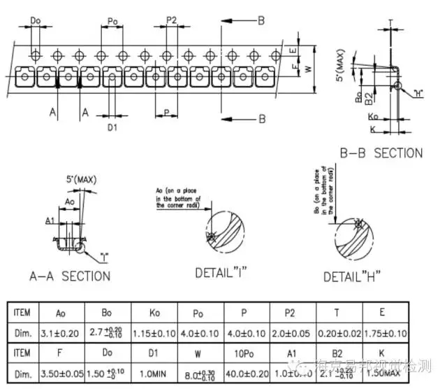 2、尺寸檢測:兩個圓心的距離、檢測圓孔是否有變形、包裝帶的總寬度、包裝帶方格的長寬。檢測精度:見以下圖紙要求。